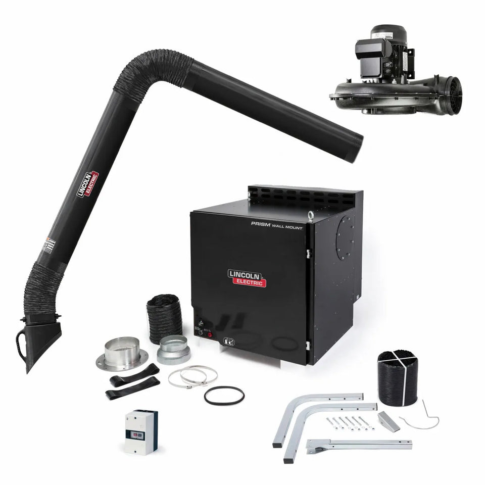Prism Wall Mount with Mechanized Cleaning One-Pak with MERV 16 filter comes with a Prism 2400 stationary fan, a starter/overload switch, and a flexible 13 ft. fume extraction arm. Capable of providing 735 SCFM in single arm configuration.