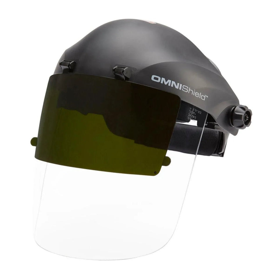 The OMNIShield's next generation design is the modern answer to impact protection. Now offered with a convenient flip-up infrared lens to switch between clear and shaded protection in seconds. This is coupled with multi-axis cushioned headgear to comfort and a modular headpiece to provide versatility for a broad range of applications.
