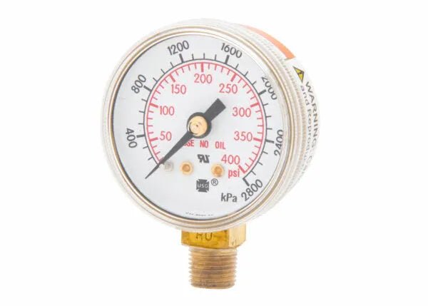 Harris 400 PSI/2800 kPa 1.5 in. replacement pressure gauge has a gold metallic painted steel case, polycarbonate clear threaded one-piece lens, steel dial and brass lower mount male stem with 1/8 in. NPT thread connection. The dual scale black markings on a white background makes it easy-to-read. This gauge is ideal for gas distribution to denote the pressure levels on Regulators using non-corrosive gas. "Use No Oil" marking on dial face for clarification. This gauge meets ANSI B40.1 standards.