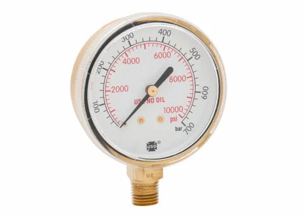 Harris 10000 PSI/700 BAR 2.5 in. replacement pressure gauge has a polished brass-plated steel case, polycarbonate clear threaded one-piece lens, steel dial and brass lower mount male stem with 1/4 in. NPT thread connection. The dual scale red and black markings on a white background makes it easy-to-read. This gauge is ideal for gas distribution to denote the pressure levels on Regulators using non-corrosive gas. "Use No Oil" marking on dial face for clarification. This gauge meets ANSI B40.1 standards.