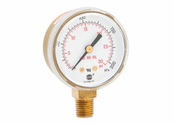 Harris 30 PSI/200 kPa 2 in. replacement pressure gauge has a gold metallic painted steel case, polycarbonate clear threaded one-piece lens, steel dial and brass lower mount male stem with 1/4 in. NPT thread connection. The dual scale red and black markings on a white background makes it easy-to-read. This gauge is ideal for gas distribution to denote the pressure levels on Regulators using non-corrosive gas. "Use No Oil" marking on dial face for clarification. This gauge meets ANSI B40.1 standards.