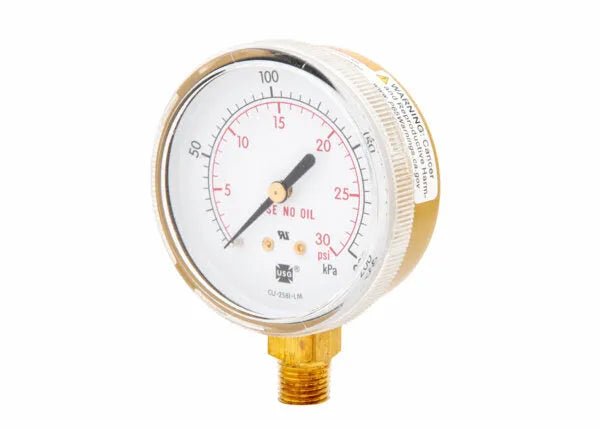 Gold painted steel dual scale 63mm x 30 PSI / 200 kPA Regulator pressure gauge with clear lens cover and 1/4" NPT brass lower stem