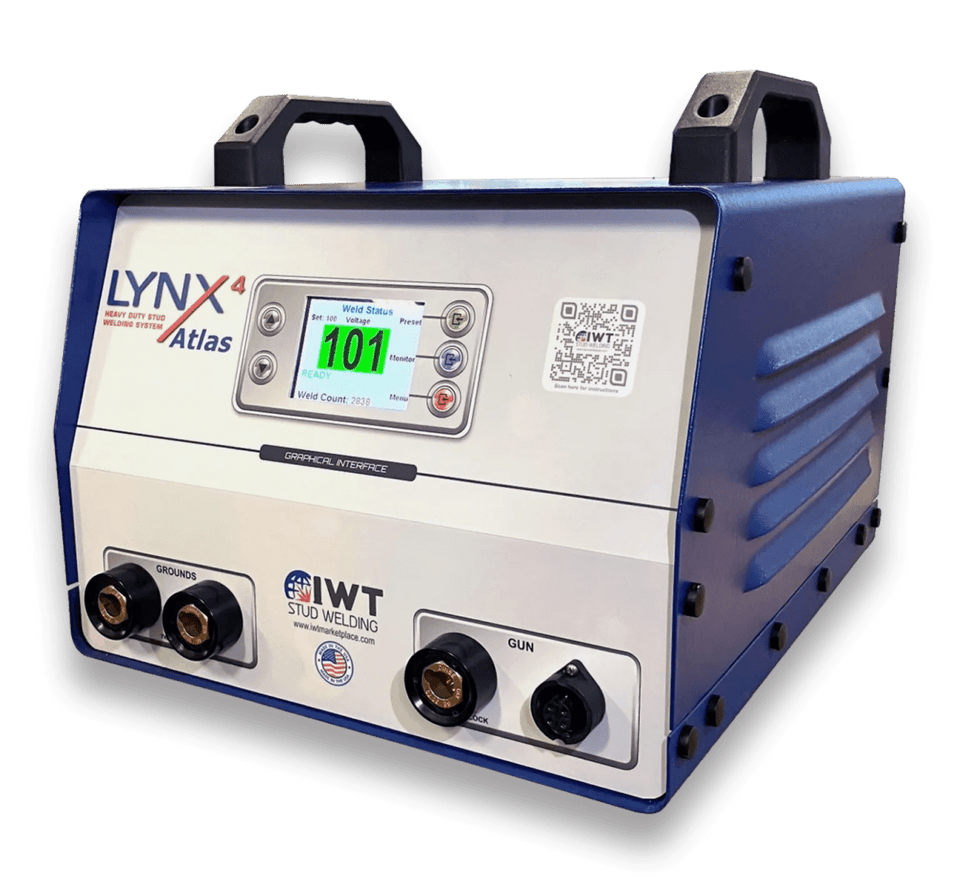 The LYNX4 Atlas has a large 3.5″ full display and can monitor and compare production welds against a refernece weld. It also features a programmable memory which stores 4 presets and has a resettable weld/job counter. Equipped with 14 pin mil. spec connector allowing remote triggering, ready signals, and reload circuitry for automation. The Atlas is sold as a stand alone power supply with two ground cables, and an interface cable.