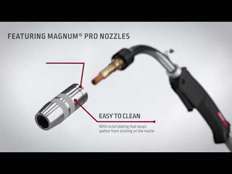 Magnum® PRO Semi-Automatic MIG welding gun with 350A 100% mixed gas duty cycle with 15 ft. cable and 0.035-5/64 in. (0.9-2.0 mm) wire diameter range.