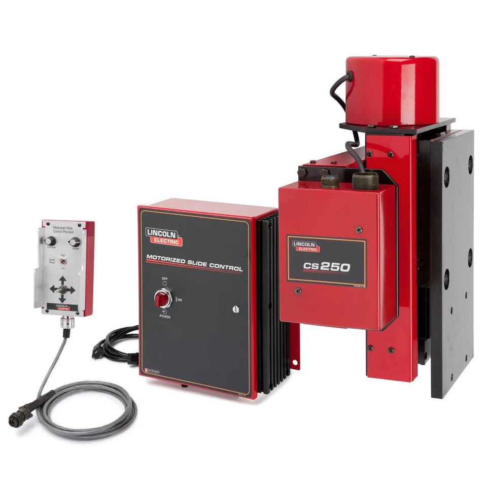 • Order a Lincoln Electric One-Pak and get everything you need to complete a welding package - all with one order number.(Packages are shipped unassembled.) K52014-0505 CS250 Cross Slide 5 x 5 in (127 x 127 mm) K52025-1 MS Control Unit K52024-1 MS Control Pendant - 10 ft (3 m) Cable K52030-1 Cross Slide Drive Cable Assembly for CS250 & CS450 - 10 ft (3 m) "