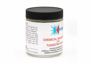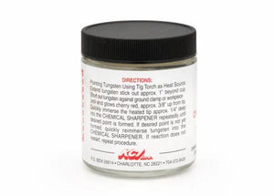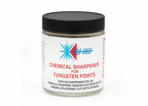 Chem Sharp is a chemical sharpener for tungsten electrode 5 ounce jar provides as many as 500 sharpenings without having to leave the work area. Grinding is eliminated completely, a plus factor since grinding can cause scratching, chipping or splintering of the tungsten. Chem Sharp will not contaminate the electrode nor the weld area.