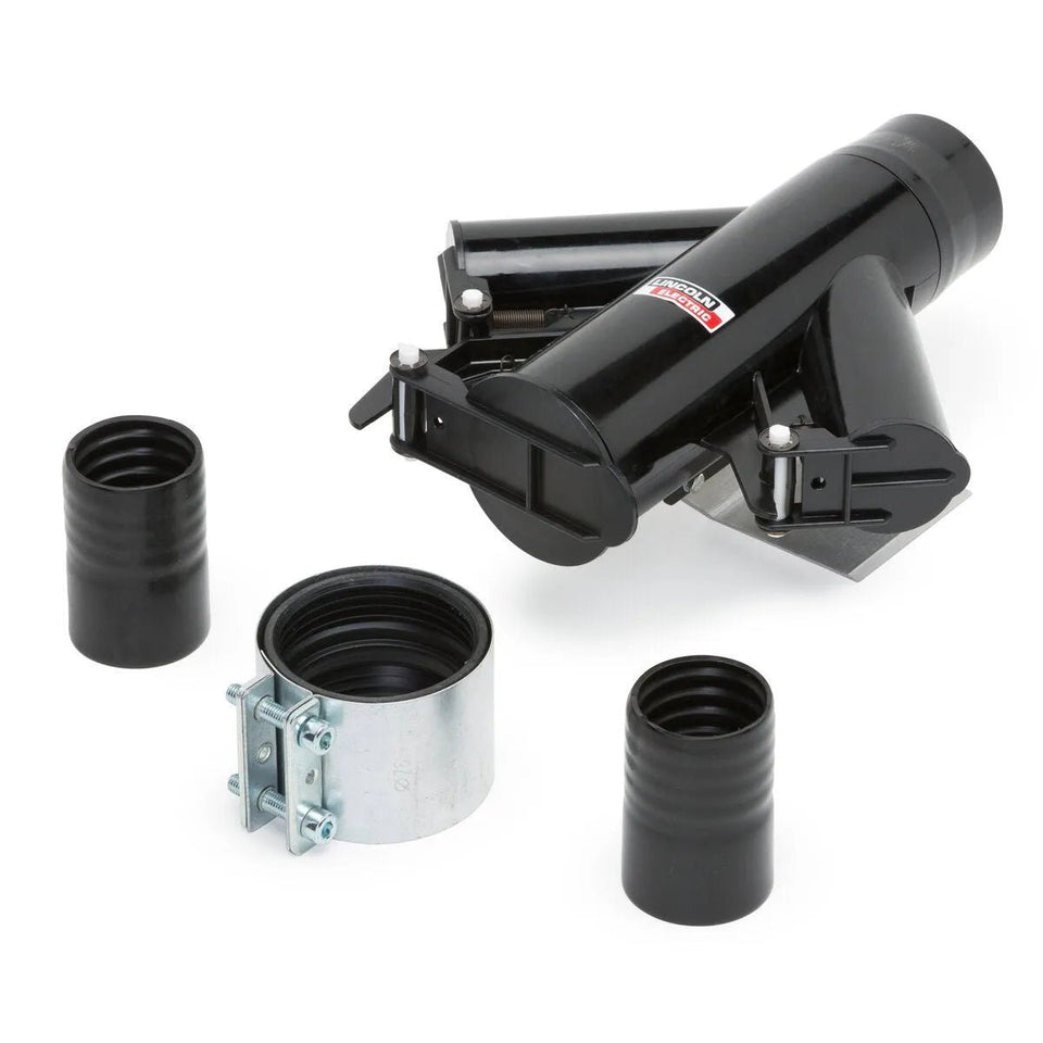 The Lincoln Connection Kit - K3968-1 is designed to easily connect extraction nozzles and/or fume guns to the X-Tractor 3A system. The kit includes the VV-50 valve, which serves as the main distribution valve and features three outlets: two with an outside diameter of 50 mm (2 inches) and one with an outside diameter of 76 mm (3 inches). The included S20591-8 Hose to Tube adapters allow for the connection of 1-3/4 inch (45 mm) I.D. hoses to the two 50 mm (2 inch) outlets of the VV-50 valve, offering flexibility and efficiency in fume extraction setups. This connection kit is ideal for use with two roll feeders and ensures seamless integration of your fume extraction system.