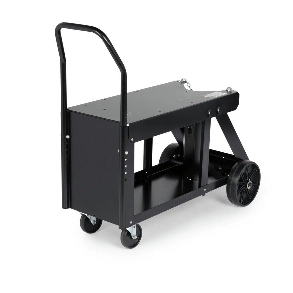 Upgrade your welding set up with this durable and versatile Utility Cart. This cart is designed to securely transport a power source, 150 cu.ft gas cylinder, tools and welding accessories. With an adjustable handle, front casters, and rear wheels, this compact cart conveniently maneuvers your welding setup across a construction site, workshop or garage.